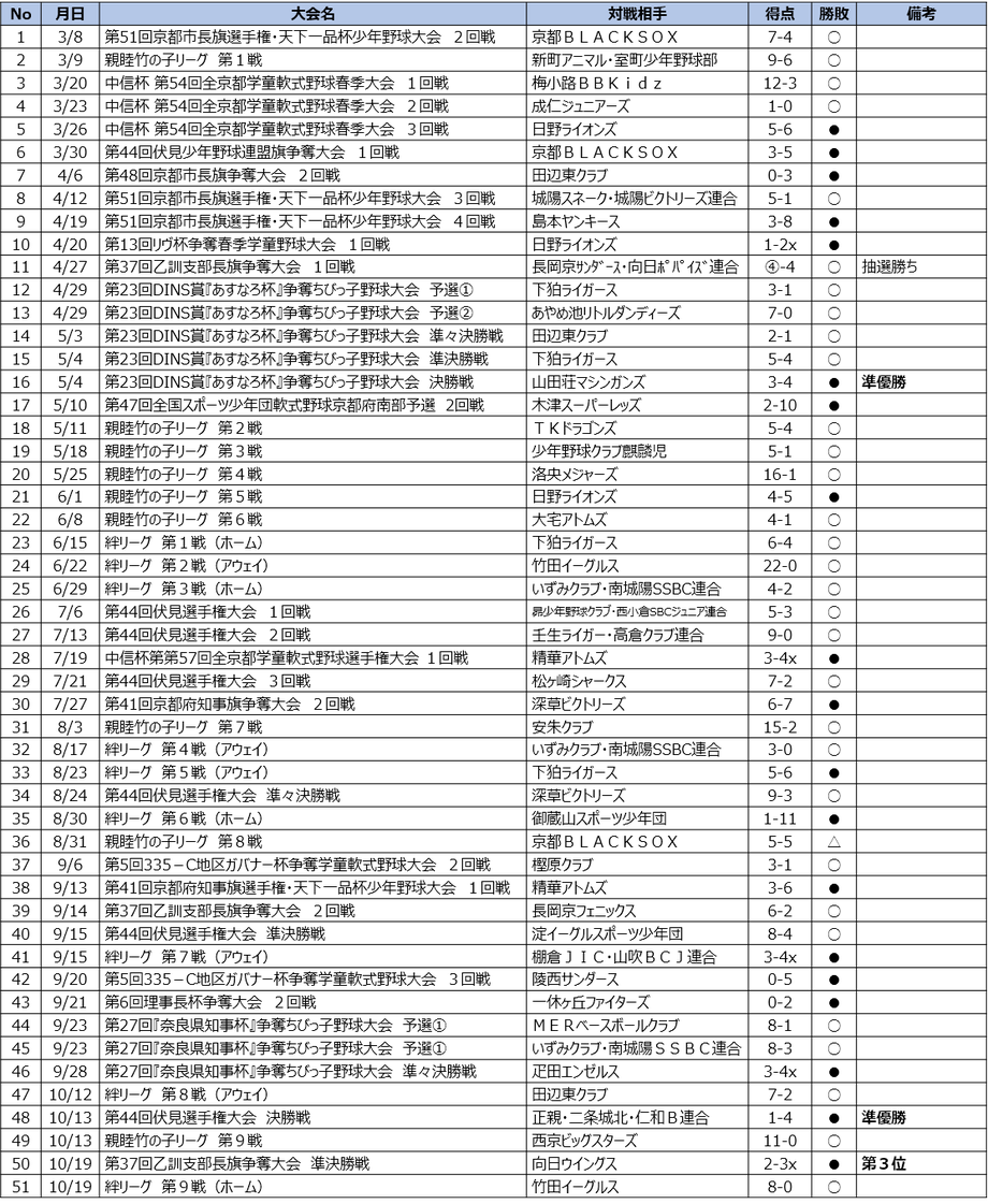 投手:ユウキ 捕手:キョウスケ 三塁打:リンタロウ(3回) 本塁打:ケイシン(2回)、キョウスケ・ユウキ(3回)