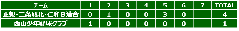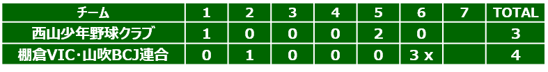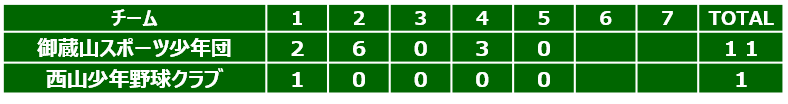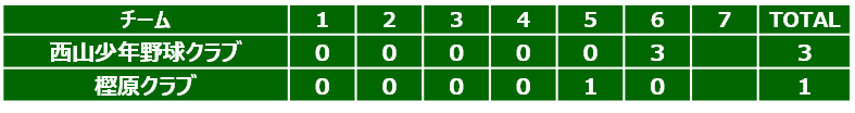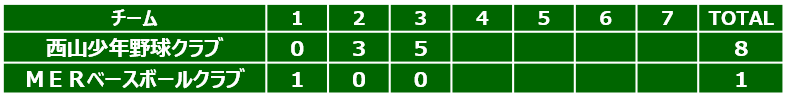 投手:ユウダイ・ユウキ・リンタロウ 捕手:キョウスケ 三塁打:ユウダイ(1回)