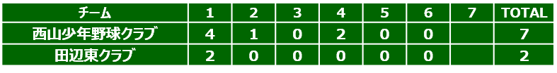 投手:ユウキ・ユウダイ 捕手:キョウスケ 二塁打:キョウスケ(1回)、リンタロウ(2回) 三塁打:ヒロタカ(2回)