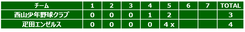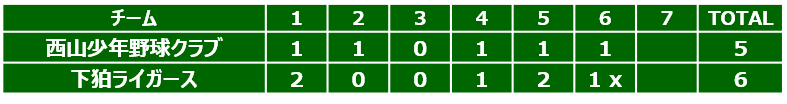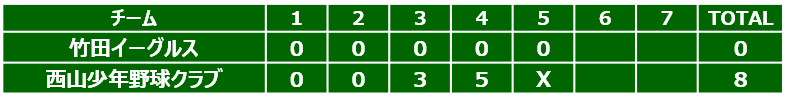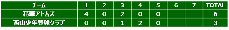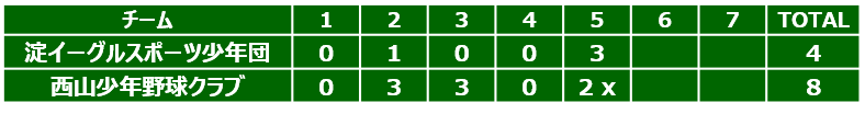 投手:ユウキ・ユウダイ・トウリ 捕手:キョウスケ 二塁打:キョウスケ(1回)、リンタロウ(5回) 本塁打:ヒロタカ(4回)