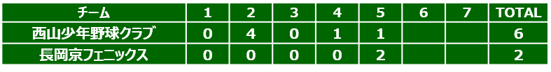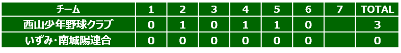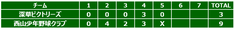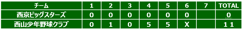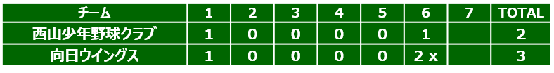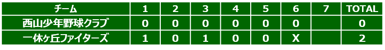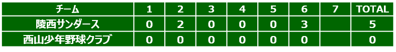 投手:ユウキ・リンタロウ・ユウキ 捕手:キョウスケ 二塁打:キョウスケ(5回)