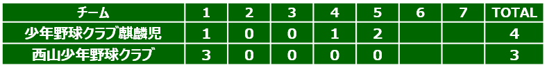 投手:ハヤト・ケイジロウ 捕手:ケイタ 二塁打:コウノスケ(2回) 三塁打:ケイタ(5回)